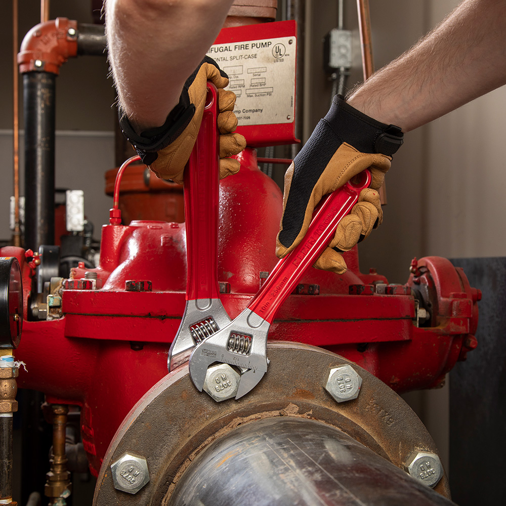 The Klein Tools adjustable spanner is designed with a smaller size but the ability to handle heavy-duty jobs. This spanner is manufactured from heat-treated alloy steel for strength and has a highly polished chrome finish. It also features a lightweight 10'' design with an extra-capacity jaw.