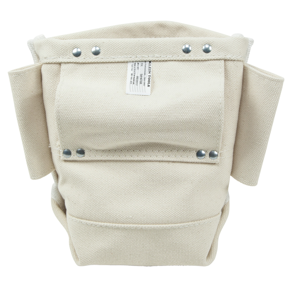 Klein's Bull-Pin and Bolt Bag holds two different bull pin sizes (1'' and 1-5/16''). Made of sturdy No. 4 canvas and a double bottom, this bag features drain holes at the bottom to release any built-up water. Tunnel loop fits belts up to 3'' (76 mm) wide.