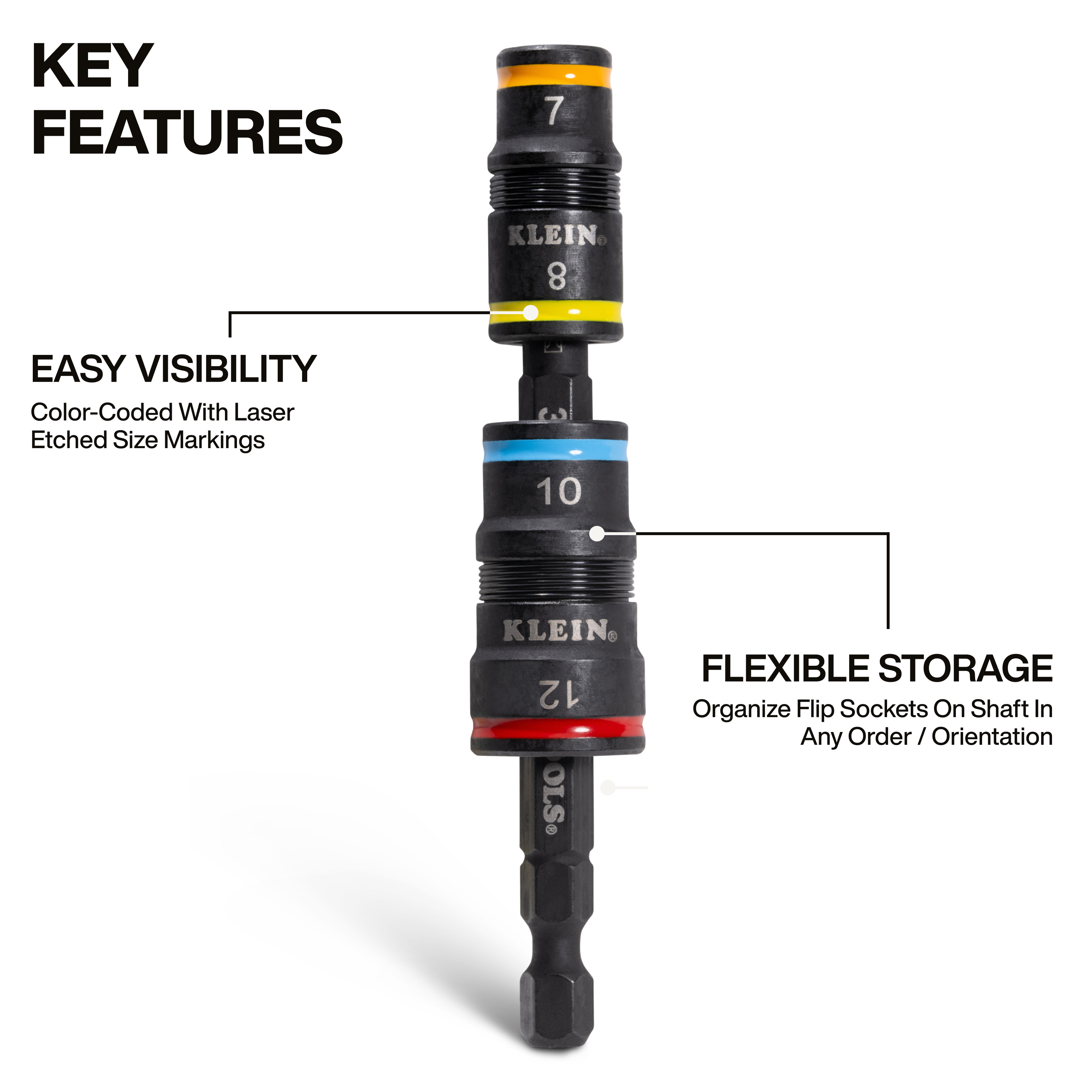 - Flip sockets can be stored in any order or orientation on the shaft