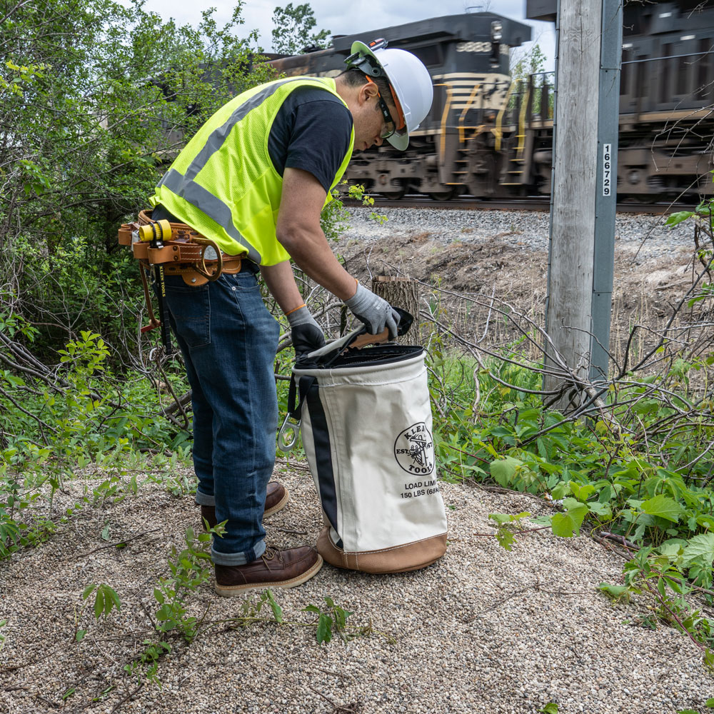 Keep your tools safe and protected with Klein's Heavy-Duty Top-Closing Tool Buckets. The top zips shut to prevent falling objects. Load-rated for up 150 lbs (68 kg), this roomy bucket holds all the necessary tools required to get the job done. Heavy-duty No. 1 canvas body with leather-reinforced bottom withstands the harshest job sites.